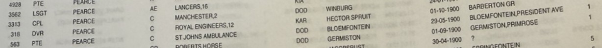 Sergeant (QSA)303 Private (SJAB SA) | charles edward willmoreDied: 2nd of January 1901 at Deelfontein of Pneumonia aged 24 years. | national fire brigades unionattached to St John ambulance brigade | |||