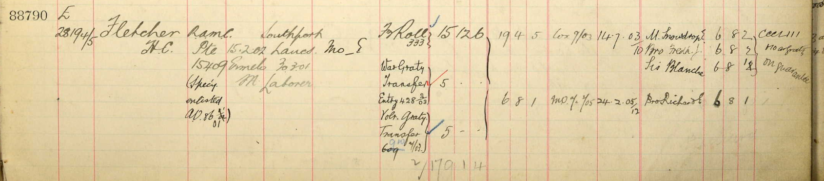Specially Enlisted Royal Army Medical Corps 18 November 1901. 16508 Private: sailed to South Africa and died of Enteric Fever on 23 May 1902 at Pinetown Bridge, aged 33 years.