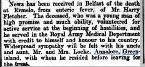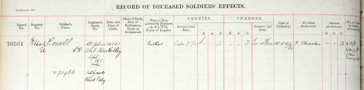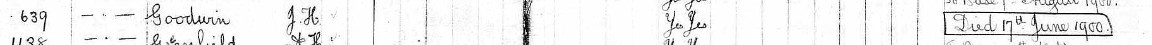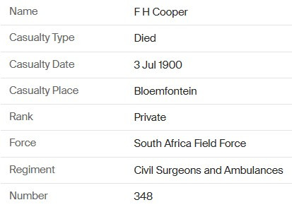 Died aged 23 years of enteric fever (typhoid) in the Stationary Military Hospital, Orange River Station, near Hopetown, Cape Colony. He was buried in the military cemetery at Orange River Station. His remains were later reinterred in West End Cemetery, Kimberley.